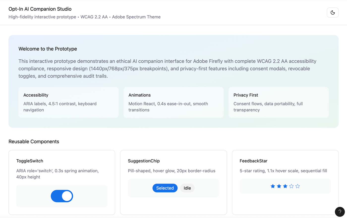 Conducted deep research via X, Reddit, and Adobe forums to identify pain points, synthesizing insights into user personas (e.g., frustrated freelancer). Develop high-fidelity design prompts optimized for the Figma prototyping ecosystem, focusing on ethical overlays with opt-in flows, micro-animations, and WCAG compliance. Iterated the prompt for dev handoff (e.g., Design System Components) and created 7 responsive screens emphasizing consent toggles and contextual HUDs.